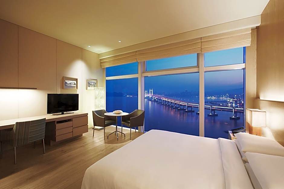 Featuring the landscape of Busan City and the yacht marina through floor-to-ceiling windows, this 81½-sq-m standard suite room comes with one queen bed and one single bed and bathroom has a bathtub. A separate lounge area with a dining table. This suite features a bathrobe, cable TV and seating area.