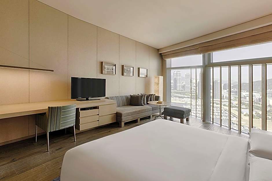 Wood and textile decor in warm beige tones welcome visitors to this 36- to 43-square-yard guestroom, which comes appointed with one king bed and a couch seating area. Floor-to-ceiling windows grant views of the city and Busan Marina. A separate rain shower and bath and TV await among the bathroom's polished granite surfaces.