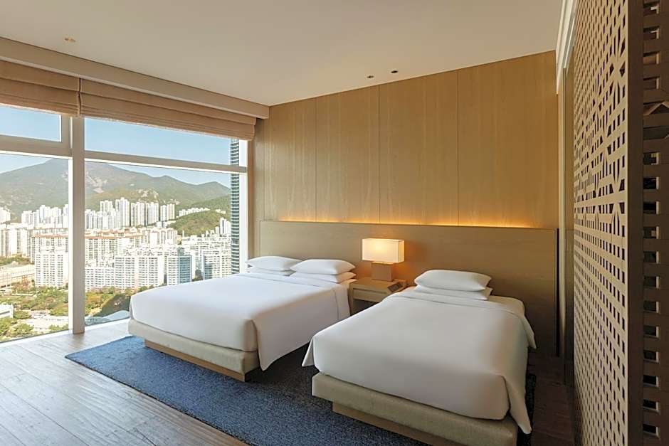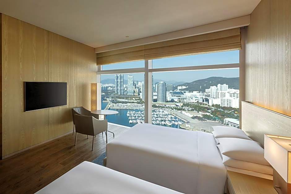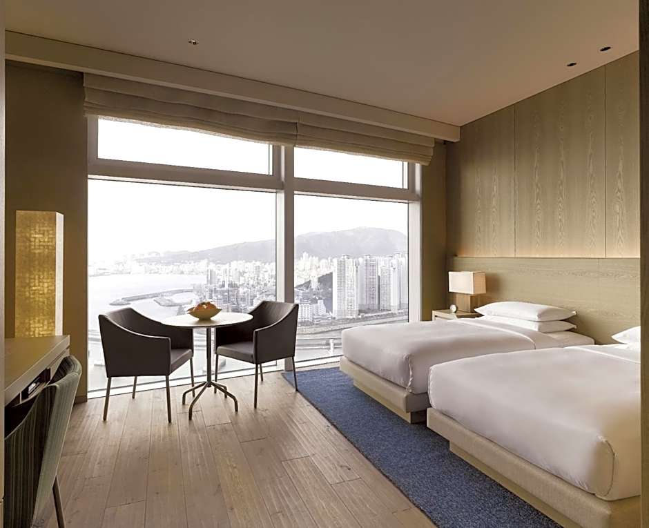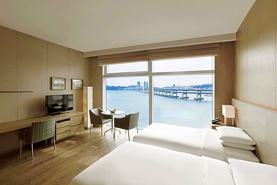 These ocean-view rooms are located on the 6th through the 16th floors. Wood and textile decor in warm beige tones welcomes visitors to this 135 ft² guestroom which comes appointed with two twin beds and a dining table with seating for two. Floor-to-ceiling windows grant views of the ocean and Gwangan Bridge. A separate rain shower and bath, plus additional TV complement the bathroom's polished granite surfaces.